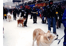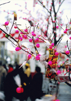 会場や市内のあちこちでは、ミズキの枝にピンク色の飴を付けた「枝飴」が華やかに歓迎してくれます。雪の白とのコントラストが、遅い春を待つ雪国の人達の気持ちを表しているかのようです。
