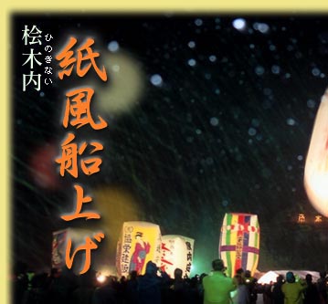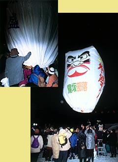 紙風船上げは、和紙を張り合わせた長さ6mほどの風船を、バーナーなどで熱風を吹き込んで膨らませ、最下部に灯油を染み込ませて固定した布玉に点火して空に放ちます。